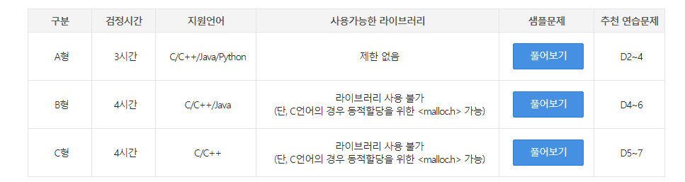 A형은 2문제를 3시간안에, B형/C형은 1문제를 4시간안에 풀어서 제출하면 되는 시험입니다.
